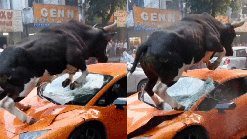 नई दिल्ली। सोशल मीडिया पर इन दिनों एक वीडियो तेजी से वायरल हो रहा है, जिसमें सड़क पर खड़ी लेम्बोर्गिनी कार पर दो सांड कूदते नजर आ रहे हैं। वीडियो में दिख रहा है कि एक सांड कार के बोनट और छत पर छलांग लगाता है और गाड़ी को नुकसान पहुंचाता है। वीडियो को देखकर आम लोग इसे असली समझकर हैरान और परेशान हो गए। हालांकि, इस वायरल वीडियो की असलियत कुछ और ही है।