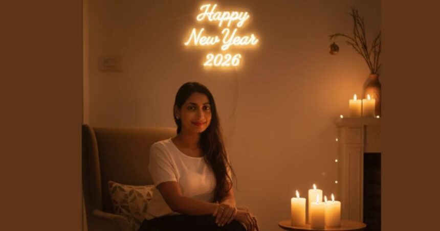 इस फोटो को इंटिमेट न्यू ईयर 2026 सेलिब्रेशन में बदलें। कैंडल लाइट और सॉफ्ट वार्म रोशनी हो। लड़की वाइट कलर के टॉप में हो, चेहरे पर शांत मुस्कान हो और बैकग्राउंड में हल्के स्टाइल में “Happy New Year 2026” लिखा हो। फोटो सिंपल और क्लासी दिखाई दे।