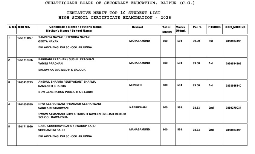 CGBSE Result 2026: 10वीं बोर्ड के रिजल्ट में संध्या नायक ने प्रदेश में किया टॉप