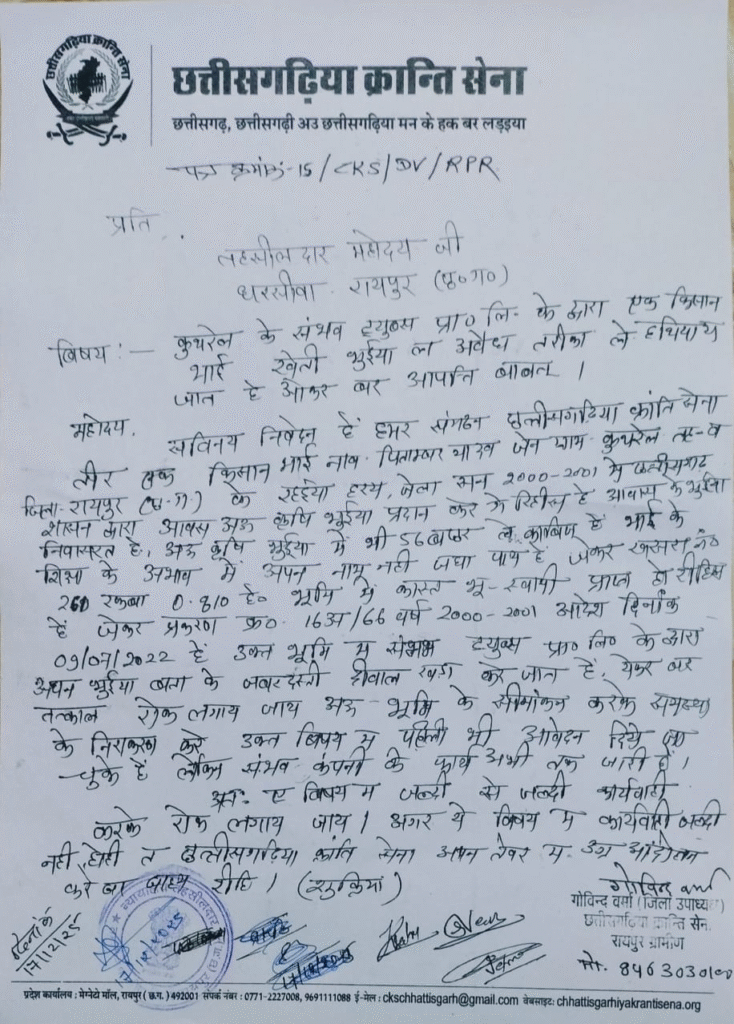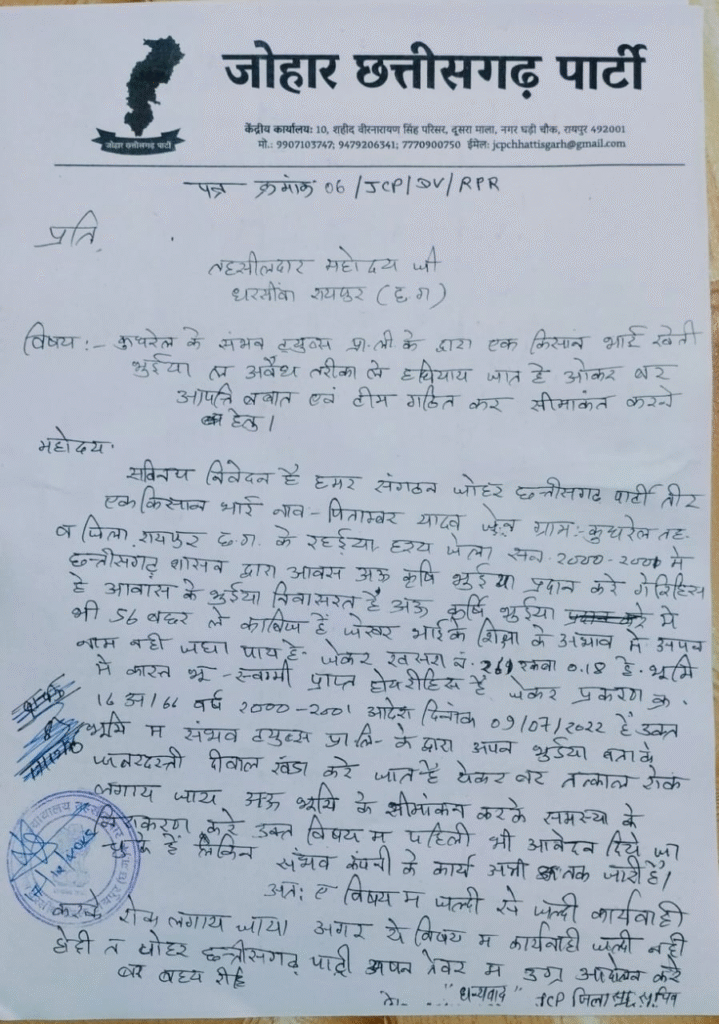 रायपुर। धरसींवा खंड़ के कुथरेल गाँव में एक गंभीर विवाद सामने आया है, जहां एक किसान की वैध जमीन पर संभाव प्लास्टिक कंपनी द्वारा जबरन घेराबंदी की जा रही है। किसान ने इस मामले में तहसीलदार कार्यालय में लिखित आवेदन देकर न्याय की मांग की है।