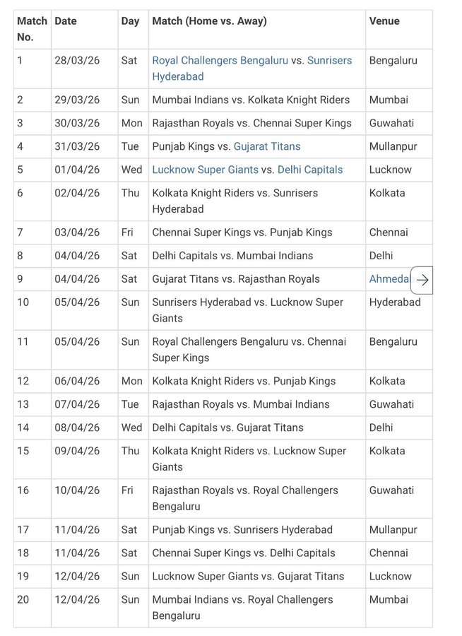 IPL 2026 Schedule: टीमों के पहले मुकाबलों का शेड्यूल