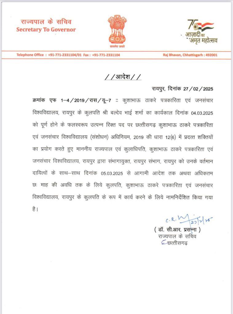 राज्यपाल सचिव डॉ. सीआर प्रसन्ना ने छत्तीसगढ़ कुशाभाऊ ठाकरे पत्रकारिता एवं जनसंचार विश्वविद्यालय (संशोधन) अधिनियम, 2019 के तहत प्रदत्त शक्तियों का प्रयोग करते हुए यह आदेश जारी किया।