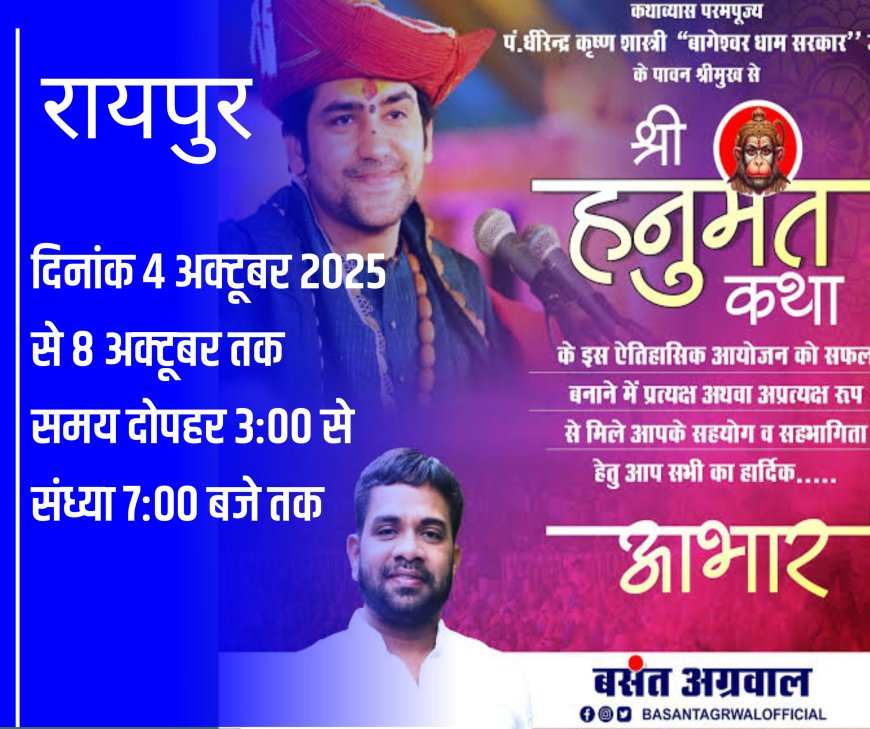 रायपुर। राजधानी रायपुर इस अक्टूबर महीने में एक और ऐतिहासिक आध्यात्मिक आयोजन की मेजबानी करने जा रहा है। गुढ़ियारी की पुण्य धरा पर बागेश्वर धाम पीठाधीश्वर, पूज्य पं. धीरेंद्र कृष्ण शास्त्री जी के श्रीमुख से दिव्य श्री हनुमंत कथा का आयोजन 4 अक्टूबर से 8 अक्टूबर 2025 तक होगा। इस दौरान कथा के साथ-साथ दिव्य दरबार भी सजेगा, जिसमें लाखों की संख्या में श्रद्धालुओं के शामिल होने की संभावना है। शहर में इसे लेकर उत्साह चरम पर है और तैयारियां युद्धस्तर पर चल रही हैं।