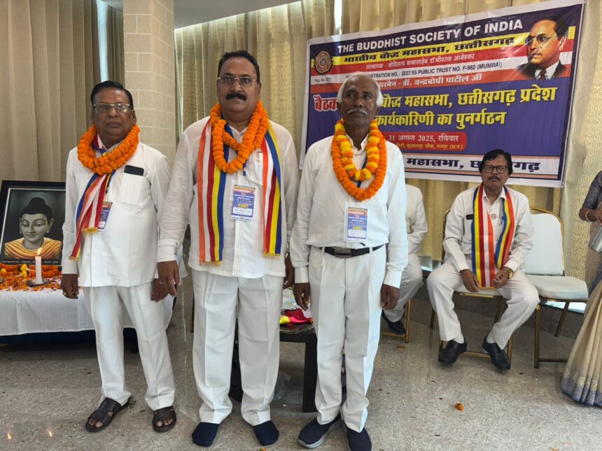 रायपुर। छत्तीसगढ़ की राजधानी रायपुर में 31 अगस्त 2025 को भारतीय बौद्ध महासभा की प्रदेश कार्यकारिणी का पुनर्गठन ऐतिहासिक उत्साह और एकजुटता के साथ सम्पन्न हुआ। रायपुर के एक निजी होटल में हुई इस बैठक की अध्यक्षता ट्रस्टी चेयरमैन चन्द्रबोधि पाटील ने की। इस दौरान संस्था के राष्ट्रीय महासचिव शंकर राव ढेंगरे, ट्रस्टी एस.आर. कानडे, अलका बोरकर और राष्ट्रीय संघटक संस्कार सी.डी. खोबरागड़े की उपस्थिति ने बैठक को विशेष महत्व प्रदान किया।