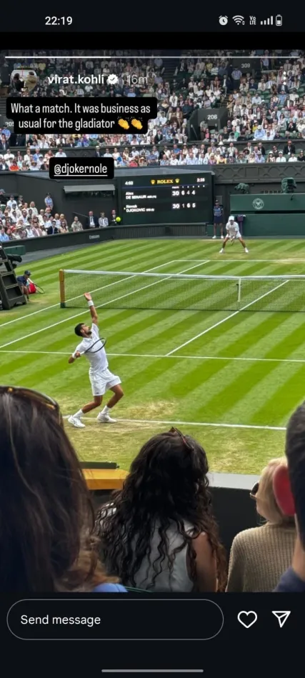 पहला सेट 1-6 से हारने के बाद जोकोविच ने शानदार कमबैक करते हुए अगले तीन सेट 6-4, 6-4, 6-4 से जीतकर विंबलडन 2025 के क्वार्टर फाइनल में जगह बनाई। उनकी इस जीत पर विराट कोहली ने इंस्टाग्राम स्टोरी में लिखा, “क्या शानदार मैच था! ये तो बस जोकोविच का सामान्य दिन था – एक ग्लैडिएटर की तरह!” कोहली ने जोकोविच को टैग करते हुए उन्हें बधाई दी।